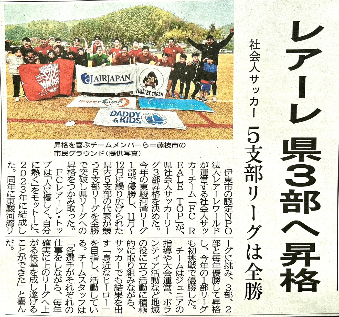 社会人サッカー レアーレ1部昇格 「勝ちこだわり社会貢献」